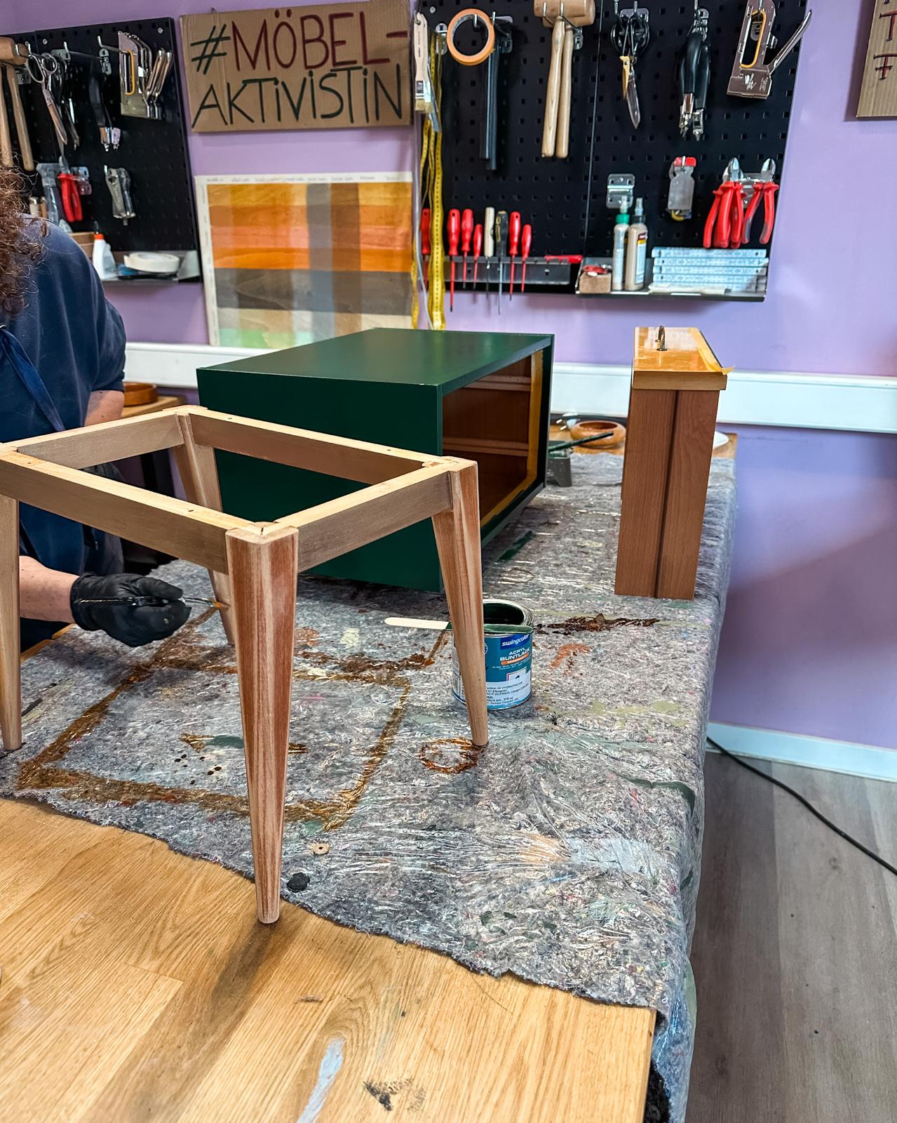 Ich stehe dir während des gesamten Workshops immer wieder als Ansprechpartnerin und Profi zur Seite, du arbeitest aber kontinuierlich selbstständig an deinem Möbelstück.