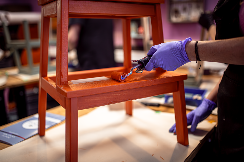 Nach ersten Übungen auf einem Übungsbrett kannst du das Gelernte direkt anwenden: Gestalte und veredle deinen eigenen Tritthocker aus Massivholz. Dank einer großen Farbauswahl (25–30 Farbtöne) und optionalen Gestaltungsmöglichkeiten wie Metallic-Highlights wird dein Werkstück garantiert zum Hingucker.